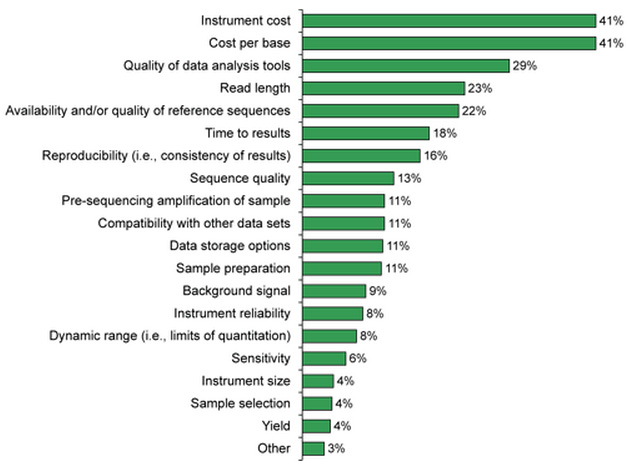 在下一代测序(NGS)缺点调查中,我们要求受访者指出哪些方面是他们认为的最重要限制,毫无争议的是,仪器和试剂价格被指出是最重要的限制因素,正如一些测序仪的价格超过1百万美元。