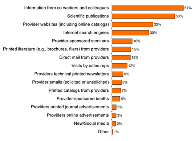 采用下一代测序技术不是一件简单的事,研究人员可能需要购买昂贵仪器、试剂和数据分析工具,而对于这些产品的评价,信息源发挥关键作用。此外,研究人员需要重新评估不同序列信息(分别来自传统技术和下一代测序技术)的价值,并将下一代测序整合到实验流程中。鉴于其中的复杂性,很正常的是,那些经常需要下一代测序的研究人员在评估下一代测序产品时会也会向同事请教信息。