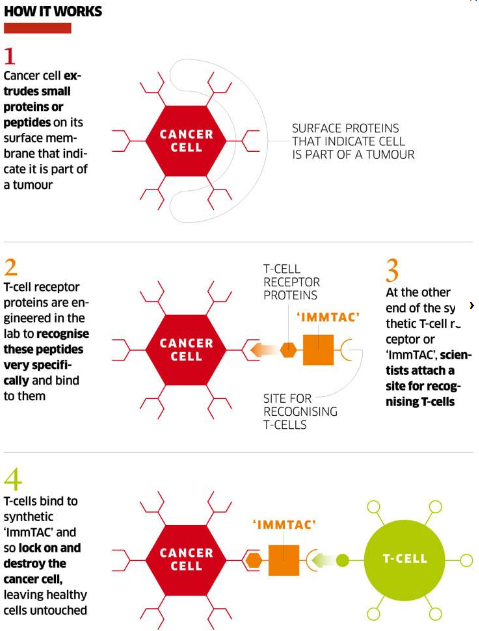 Immunocore的T细胞抗癌方法如下:他们从“T细胞受体”(这种蛋白会从T细胞的表面伸展出来并依附到其敌对目标上)那里获得了灵感,设计出了一些小小的蛋白分子——ImmTACs,其能很好地扮演双面胶的角色。它们的一面会非常紧密且有针对性地贴到癌细胞上,对健康的细胞则置之不理。而另一端会紧贴T细胞,以此来杀死癌细胞。