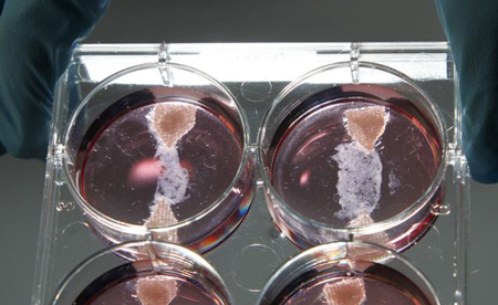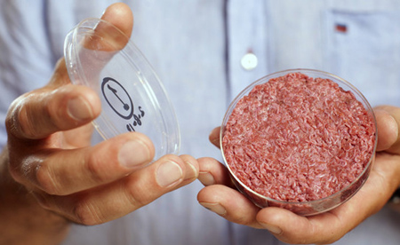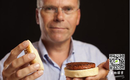 这块小小的人造牛肉是荷兰马斯特里赫特大学Mark Post教授七年研究的成果。他带领研究人员从牛的肌肉组织中分离出干细胞,放入营养液中,促进其生长和增殖。三周后干细胞的数目超过100万个,研究人员再将其转移到数个培养皿中,细胞合成大约一厘米长、几毫米厚的“肉丝”。研究人员收集“肉丝”,做成小“肉丸”冷冻起来,最后凑足一块肉饼的量。
