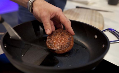 在发布会现场,研究人员首先用红甜菜根汁和藏红花为人造牛肉着色,以求达到以假乱真的效果。然后加入了一些汉堡传统烹饪所用的调料和食材(比如盐、面包屑和蛋粉)制作汉堡。制作完成后,邀请两名自愿试吃者品尝。