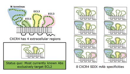 为了验证DNA免疫技术的有效性,研究人员研制出3种MMP分子(GPCRs CXCR4,ADORA2A和 CD20)的单克隆抗体。值得肯定的是,这项技术诱导出针对单一MMP分子的大量单克隆抗体(它们具有独特的结合位点和潜在功能),从杂交瘤细胞中分别筛选出93种CXCR4单抗、15种ADORA2A单抗以及51种CD20单抗。