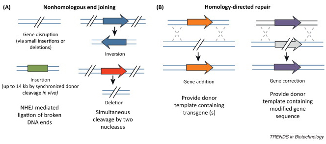 图2 使用位点特异性核酸酶进行基因组编辑操作时可能出现的几种情况。核酸酶切割DNA形成DSB之后细胞可能会借助同源重组修复途径,或者是NHEJ修复途径对DSB进行修复。(A)在缺乏外源质粒DNA模版的情况下,细胞会通过NHEJ机制进行修复,在基因组中形成小型的插入或者缺失突变。在存在双链寡聚核苷酸分子,或者在细胞内存在线性的质粒片段时,可以通过NHEJ机制在基因组中插入大段的DNA序列,最长可以插入14kb的序列。同时形成两种DSB之后会形成缺失、倒位或者倒位的序列转位等突变。(B)在存在同源序列的外源模版的情况下,细胞会通过同源重组修复机制修复DSB,在基因组内插入1个或者多个转基因,或者对基因组中的错误基因进行修复。