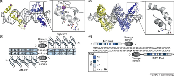 锌指核酸酶(Zinc-finger nucleases, ZFN)和转录激活因子样效应因子核酸酶(transcription activator-like effector nucleases, TALEN)这两种新型的核酸酶重新定义了传统生物学研究的界限和范畴。这两种核酸酶都是嵌合体,都是由经过设计的、序列特异性的DNA结合元件(programmable, sequence-specific DNA-binding modules)和非特异性的DNA切割结构域结合而成的。ZFN和TALEN都可以对DNA进行各种遗传修饰,这两种核酸酶的作用机制都是先对DNA双链分子进行切割,形成DNA双链断裂切口(DNA double-strand break),然后激活细胞内的非同源末端连接修复机制(nonhomologous end joining,这是一种非保真的、容易出现遗传突变的修复机制),或者同源重组修复机制(homology-directed repair,这是一种高保真的修复机制,不容易出现突变),利用细胞自身的修复机制对DNA进行遗传学修饰。接下来, 我们就将为读者介绍这种新型的、序列特异性的核酸酶,看看它们在遗传分析和遗传 改造工作中都能发挥哪些功用。此外,我们还会重点介绍ZFN和TALEN在临床治疗方面的潜力,以及这些核酸酶,与包括最新出现的RNA介导的、基于成簇的规律间隔的短回文重复序列和Cas蛋白的DNA核酸内切酶(clustered regulatory interspaced short palindromic repeat (CRISPR)/Cas-based RNA-guided DNA endonucleases)在内的其它核酸酶在未来的发展潜力。