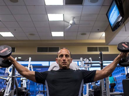 于是即使在寒冷的早晨,他也能在拂晓就前往健身房。他用哑铃和杠铃练习举重,并快速地轮流进行各种锻炼。45分钟后,他完成了预定的锻炼方案,大汗淋漓。