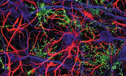 星形胶质细胞(红色)和未成熟的少突胶质细胞(绿色)与大脑的海马神经元(蓝色)相互交织
