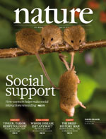 本期封面所示为进行社会性游戏的巢鼠(禾鼠)。人们此前一直不知道社会奖赏编码背后的神经机制,尽管需要增强适应性社会互动来在整个演化过程中始终保持这样的行为。Robert Malenka及同事在本文中报告说,在小鼠伏隔核中,肽激素“后叶催产素”对于向“中等多棘神经元”上的激发性传输的社会性增强和一种形式的突触前长期抑制来说都是所必需的。如果“后叶催产素”受体被特意从来自“背缝神经核”(脑中5-羟色胺的主要来源)的输入中删除的话,这种社会性增强就会被中断;通过阻断伏隔核中的5-羟色胺受体,这种社会性增强也会被中断。“后叶催产素”和5-羟色胺系统之间这种协调的活性,为编码社会性增强提供了一个可能的机制,也为进一步研究社会功能失调的神经机制提供了目标。[链接]
