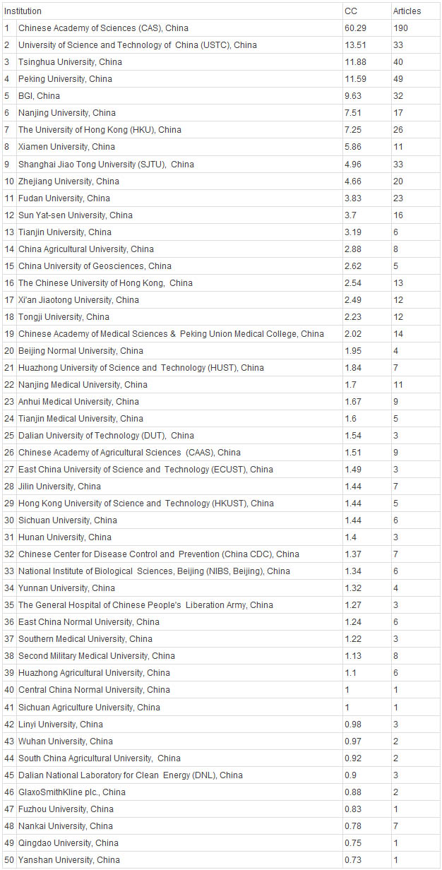 中国学者论文数量比日本学者论文数量多 8 篇。中国各学术机构中,发表论文数量最多的是中国科学院共 190 篇,占总数的 41.5%。排列在前十名的机构分别是中国科技大学 33 篇、清华大学 40 篇、北京大学 49 篇、华大 32 篇、南京大学 17 篇、香港大学 26 篇、厦门大学 11 篇、上海交通大学 33 篇、浙江大学 20 篇。