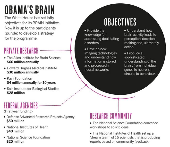 在此前一个月,总统Barack Obama公开了堪比登月计划的人类神经系统科学计划,该计划可与欧洲历时10年、耗资10亿欧元(约合13亿美元)的人类脑计划相媲美。Obama承诺,美国将通过推进创新神经技术脑研究(BRAIN)计划,研发一系列研究大脑活动的工具,旨在了解人类思维领域实现重大突破。