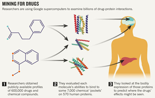 要预测那些未知化合物与靶标蛋白如何在体内相互作用更具有挑战性。在建立网站的时候,Cardozo的团队从PubChem和欧洲生物信息研究所的ChEMBL数据库搜集了约600000种分子,这些分子又可以组合成数百万的化合物。这个研究团队评估了这些分子与7000种人类蛋白结合口袋结合的程度,并将这些数据也都纳入到数据库中。计算巨头谷歌为研究人员提供了相当于超过1亿小时的计算机处理器,帮助他们完成这项庞大的工作。
