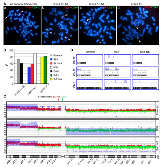 非整倍体染色体的不稳定性是癌症的一大特点。研究者观察了由原代细胞培养出的神经胶质瘤细胞的7号染色体(Chr7)拷贝数变异(CNV)情况,发现普遍出现在胶质瘤中的Chr7-CNV的肿瘤异质性细胞,在高级别的胶质瘤(携带超过2个拷贝数的Chr7)中出现的百分比较低级别的胶质瘤更高。更有趣的是,由亲本培养出的所有的Chr7-非整倍体细胞形成的胶质瘤细胞系再现了由单细胞衍生的次生培养物。