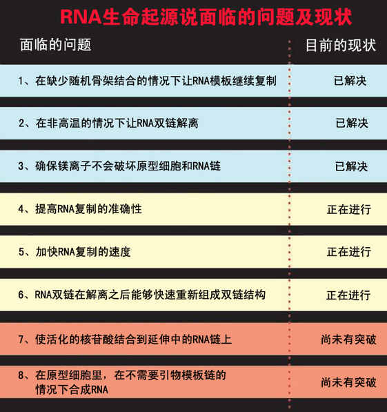 最大的问题就是,如果不借助RNA聚合酶,那么在RNA复制过程中所需要的最重要的成分——镁离子的问题。如果缺乏镁离子,这个复制反应的速度就会变得非常慢,很难想象在生命起源过程中的反应速度会这么慢。但是镁离子也有它的弊病。它们会使脂肪酸原型细胞破裂,而且也会使RNA链分解,其分解速度甚至与合成速度一样快。