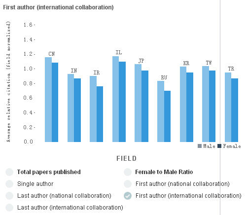 研究人员确认了2700万名作者中65.2%的性别身份之后,对其进行分析。分析结果发现,在学术研究中,存在性别对学术论文的同行评议或者被引用情况的不同差异,而是全球性的普遍现象。论文第一作者的性别和引用情况:如果论文的关键位置是女性作者,其论文的被引频次要少于男性作者处于论文的关键位置的引用;如果仅仅只有一个作者的论文,或者是与国内作者的合作论文、与国际作者的合作论文,这种情况依然存在。下图足以说明,图1中数字反映相对引用的平均数量。