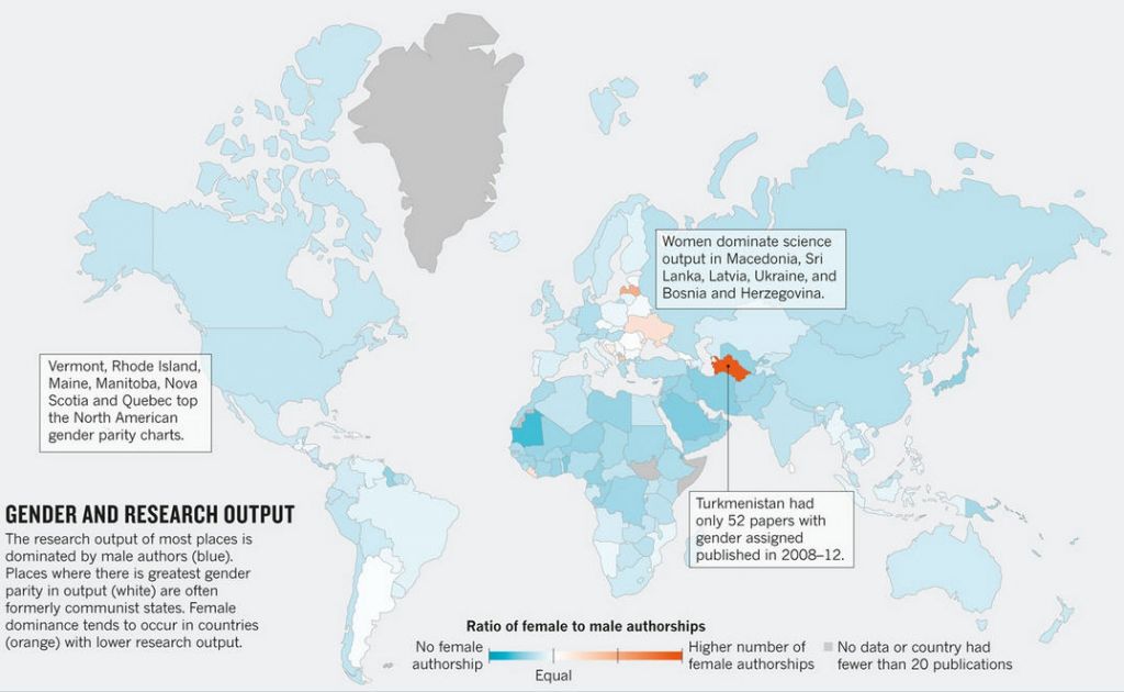 据《自然》(Nature)杂志网站2013年12月11日报道,加拿大蒙特利尔大学(University of Montreal)信息科学家文森特·拉里维埃(Vincent Larivière)助理教授和印地安纳大学伯明顿分校(Indiana University Bloomington)信息与计算学院的倪超群(ChaoqunNi音译)以及蒙特利尔魁北克大学(University of Quebec At Montreal, UQAM)的合作者研究发现,在学术出版系统的存在严重的性别差异。研究人员利用Web of Science数据库,检索了2008-2012年之间发表的科学论文,包括作者姓名和工作单位。那些非同行评议的学术论文或者被认为不是“对学术知识的原创贡献(original contributions to scholarly knowledge)”的排除在统计之外,如给编辑的信函,书评等。然后对作者进行赋分,将作者署名位置的重要性视为资深作者、第一作者等等。最后确定所有论文的性别构成,编制名称列表。