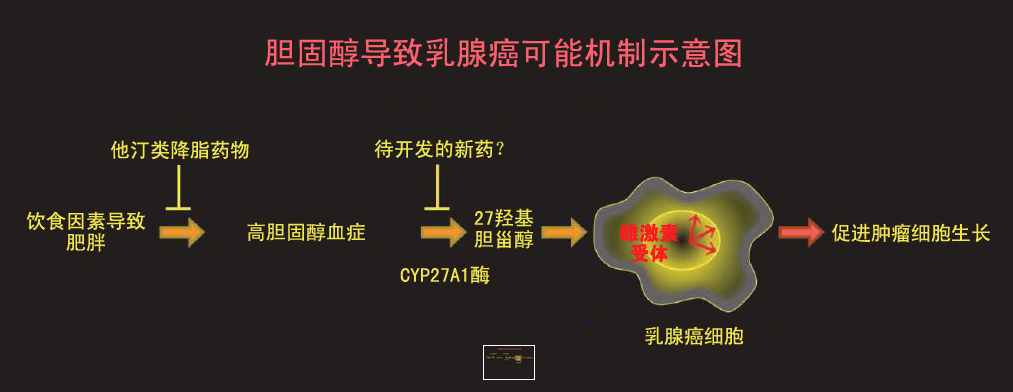 血浆胆固醇水平升高在肥胖人群中非常多见,而高胆固醇血症与乳腺癌和其它多种癌症的关系都非常密切。对于绝经期(past menopause)妇女的风险更高,因为女性绝经之后不会再分泌雌激素,原本应该是乳腺癌发病风险比较低的人群。几年前,美国德克萨斯大学西南医学中心(University of Texas Southwestern Medical Center in Dallas)的科研人员与美国杜克大学医学院(Duke University School of Medicine in Durham, North Carolina)的科研人员合作开展过一项研究工作,正是这项工作发现了胆固醇与肿瘤之间的关系。他们发现胆固醇的代谢产物27羟基胆甾醇(27-hydroxycholesterol, 27HC)在很多组织中都能够起到雌激素样的作用。这一发现让当时参与这项工作的西南医学中心的Philip Shaul,和杜克大学医学院的分子药理学家Donald McDonnell非常兴奋,他们又各自开展了研究,试图揭示27HC分子与乳腺癌之间的关系。