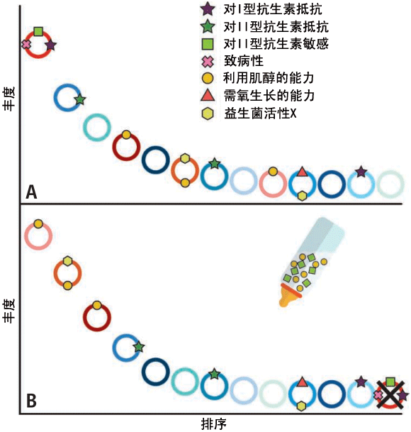 基于基因组信息的抗生素选择方案。能够掌握整体情况,明确其中每一种微生物功能的宏基因组学技术对临床工作也有一定的指导意义。如上图所示,根据环境中每种微生物的丰度从高至低进行排序。其中圆圈代表基因组。圆圈上的各种符号和标记代表各种性状,比如对抗生素的耐药性或者底物代谢能力等。在治疗之前(A),具有益生菌活性的微生物含量很少,其中大部分都是致病菌。根据宏基因组学分析之后给予相应的抗生素进行治疗,就能够大量消灭致病菌,使益生菌的丰度明显上升(B)。