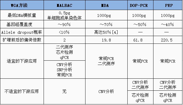 MALBAC与其他常用的全基因组扩增方法(whole-genome amplification,WGA)比较如下: