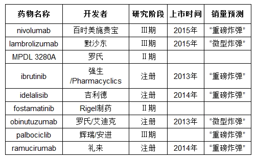 下表为癌症潜力新药品种(注:obinutuzumab于2013年11月1日获得FDA批准上市,ibrutinib于2013年11月13日获得FDA批准上市,“微型炸弹”:年销量超过4亿美元;“重磅炸弹”:年销量超过10亿美元;超级“重磅炸弹”:年销量过20亿美元;下同)
