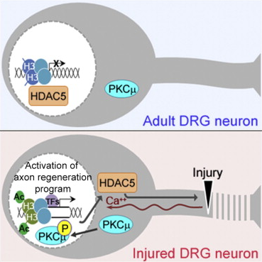 成功的轴突再生长需要细胞核中一个基因表达程序的开始;然而,这一程序是由什么激活的机制却一直没有搞清。Cavalli和同事如今发现,组蛋白去乙酰化酶5(HDAC5)的核输出在受伤后诱发再生长相关基因转录中扮演了一个重要角色。