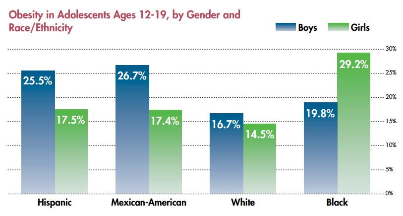 12-19岁美国不同族群及性别青少年超重及肥胖率(图片来自nccp.org)