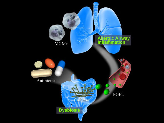 研究人员发现,在服用了抗生素的实验鼠肠道内,一种有害的念珠菌数量增加,它们制造的物质会激活免疫细胞,引发支气管炎症等过敏反应。使用遏制念珠菌增殖和发挥致病作用的药物后,实验鼠的哮喘症状减轻了。