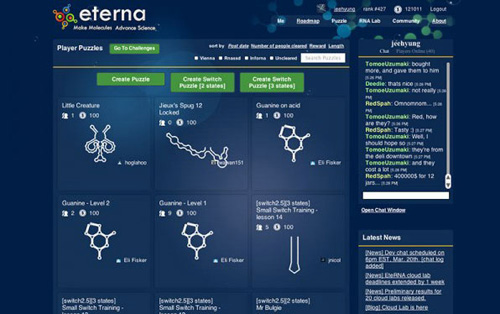 众包可用于筹集资金,也可用于虚拟实验。通过将虚拟游戏玩家和真实的生化实验室连接在一起,研究人员众包了他们的实验。一个名为EteRNA的游戏可以让玩家远程执行真实的实验,去验证有关RNA分子折叠的理论预测。