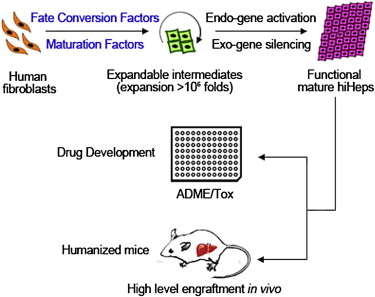 传统的转分化研究仅采用目标细胞的命运决定因子来诱导细胞类型的转变。邓宏魁研究组发现利用这一方法,仅仅过表达肝脏实质细胞的命运决定因子HNF1A、HNF4A和HNF6并不能获得功能成熟的人肝脏实质细胞,而只有在同时过表达功能成熟因子ATF5、PROX1和CEBPA的情况下,才能获得功能成熟的人肝脏实质细胞,且诱导效率超过90%。由这种新方法获得的细胞被命名为人诱导性肝脏实质细胞(human induced hepatocytes, hiHeps)。它具有成熟肝脏实质细胞的特征,特别是其药物代谢能力和肝脏毒素敏感性与新鲜分离的人成体原代肝脏实质细胞相当,为体外的药物高通量筛选提供了新的细胞来源。