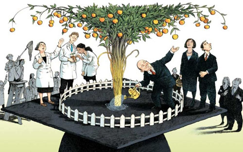 实际上,Evans认为,企业鞭策学术界探索未知领域。他还写道,“企业合作者将地位高的学术界拉离验证定理,转向推测领域”。例如,BP投资5亿美元研究经费到加州大学伯克利分校领导的财团中,用于探索利用植物纤维素或作物秸秆制造生物能源。BP在这一领域几乎毫无经验。在这种情况下,许多最后的发明对研究人员有利,但与公司经营策略无关。