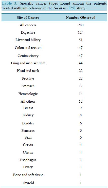 2013年,台湾北荣民总医院学者苏易峰及其研究团队的一项以人群为基础的研究,确定了胺碘酮治疗与癌症风险的增加有关。这是第一次大规模的研究评估胺碘酮治疗的患者的癌症风险,它包括6418名接受胺碘酮治疗2.5年左右的患者,其中有280名患者患上癌症。结果表明接受胺碘酮治疗的患者比一般人群患癌症的比例大,具体结果见下表: