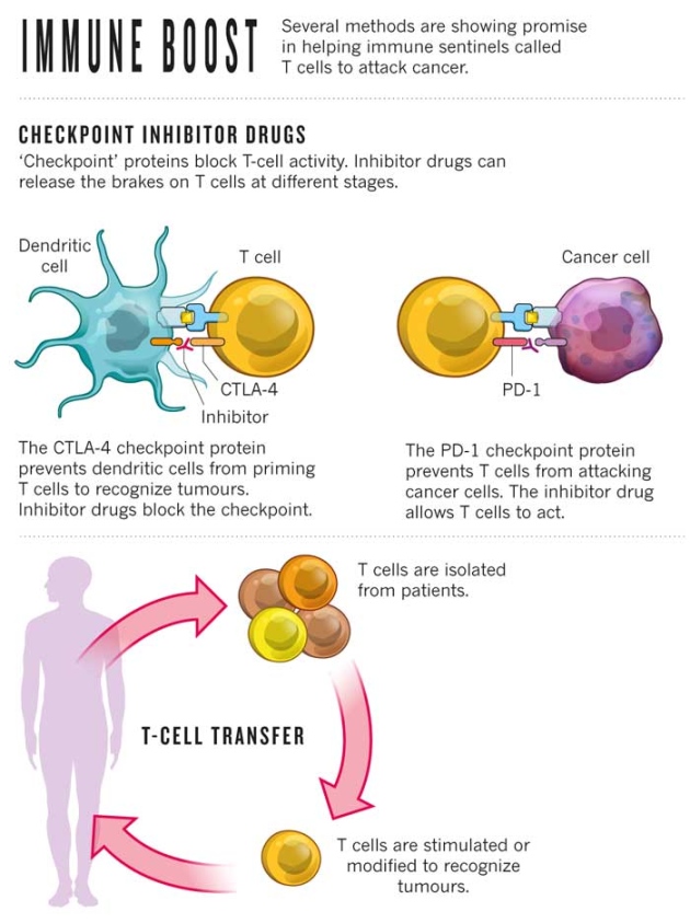 尽管如此,Yervoy方面研制出检查点抑制剂,一种抑制检查点蛋白质的药物。这促使研究人员寻找其他潜在的靶蛋白。批准Yervoy的时候,有些研究人员已经开始关注PD-1,某些癌症用这种检查点蛋白来关闭肿瘤的周围的T细胞方阵。