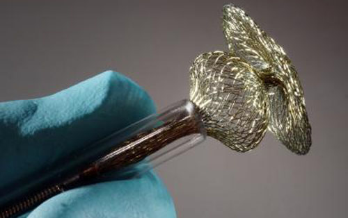 他们的研究对象是由极具弹性的镍钛合金制成的细丝,如治疗心脏隔膜缺陷时所植入的封堵器。这种封堵器由两个用细金属丝编织成的伞形网罩组成,约为一元硬币大小,它可以被拉成细长的一束后放置在心导管内。“依靠这种手段我们可以通过微创手术把封堵器植入人体”,Undisz博士介绍说。理想情况下,植入物可以在患者体内携带多年。