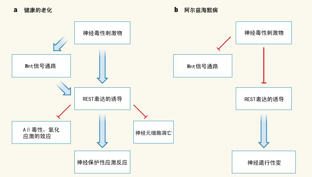 Lu等人在研究中使用了一系列令人眼花缭乱的试验方法,从而证明REST的神经保护功能的缺失可导致阿尔兹海默病患者的大脑神经元出现易损性。Lu等人观察到,在健康衰老者的大脑中,细胞核中的REST既能够将一些促凋亡基因作为靶标,还能够抑制它们的表达,此外REST也能够抑制一些特殊酶(参与阿尔兹海默病病理过程)的编码基因的表达。但是患者的大脑却不会产生这种抑制作用,从而诱导了其它基因的表达,而这些基因可能是神经元丢失和神经退行性变的致病机制(图1)。