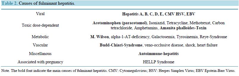急性肝功能衰竭的最常见的原因包括:毒性肝炎(尤其是甲肝(HAV)、和乙肝(HBV))、药物过量(特别是扑热息痛)、特殊的药物反应、摄入毒素和代谢紊乱。然而,在相当一部分病人的病因无法确定,尽管系统筛查发现了一些罕见的病毒和其它不太常见的原因包括:威尔逊氏病、缺血性肝炎、Budd-Chiari综合症、雷氏综合症和恶性肿瘤。此外,一些罕见的重型肝炎与丙型肝炎病毒感染有关,总结如下表:
