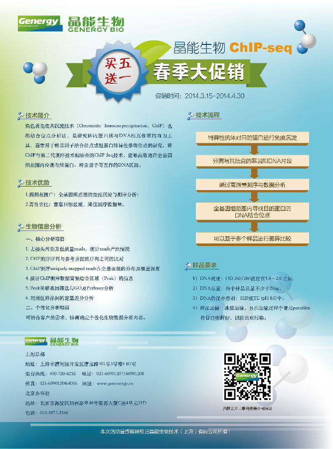 晶能生物ChIP-seq春季大促销:买五送一 促销时间:2014.3.15-2014.4.30
