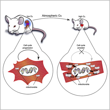 由于出生后立刻接触富含氧气的空气,心脏细胞建立起线粒体这一细胞的发电所来增加氧化作用。线粒体大量生成氧自由基损害DNA,最终造成了细胞周期阻滞。