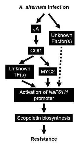 图3:野生烟草抵御链格孢菌入侵的工作模型。当植物感受到链格孢菌入侵后,激活茉莉酸的生物合成和信号转导过程,COI1下游的转录因子MYC2以及其他未知的转录因子通过结合到scopoletin合成关键酶基因F6’H1的启动子区,调控scopoletin的生物合成,进而抵御链格孢菌的入侵。因为外源茉莉酸甲酯的处理不能直接激活scopoletin的生物合成,因此推测还有一条不依赖茉莉酸的信号途径参与调控scopoletin的合成。