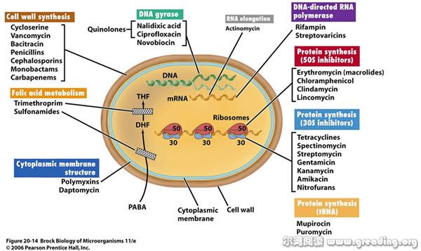不同的抗生素和抗菌剂针对细菌的目标不同(图三):