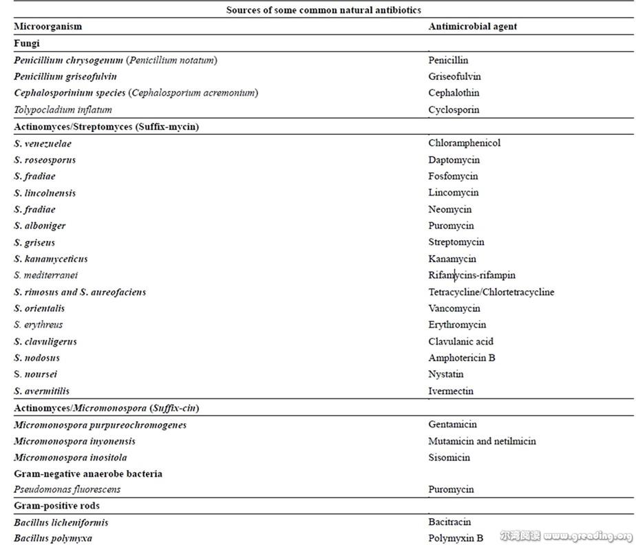 科研出版社英文期刊《Health》(健康)2014年2月刊上发表了英国伦敦大学Godfrey S. Bbosa等人的研究成果。学者向我们介绍了抗生素和抗菌剂的发展进程,药物营销方式和目前为止带来的有利、不利的影响,内容翔实,图表众多。抗生素和抗菌剂的主要来源包括:链霉素(Streptomyces)、青霉素(Penicilliums)、放线菌(Actinomycetes)和芽孢杆菌(Bacilli)(见表一)。