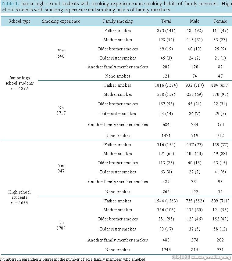日本奈良医科大学医学院Hideko Morikawa等人将研究成果发表在科研出版社2014年5月的英文期刊《Open Journal of Preventive Medicine》(预防医学期刊)上。该研究的目的是确定家庭吸烟习惯对青少年的吸烟经验的影响,为反吸烟策略提供信息。研究的对象为2004年日本奈良县的初中生(4776人)和高中生(5047人)。初中生选取了20所初中的学生,高中生选取了15个都道府县的一到三年级学生。实验抽取了中学生在“预防儿童与生活习惯相关疾病的调查”中的数据,对这两组学生吸烟经验比例的优势比(OR),进行卡方检验(chi-square test),依据是他们的父亲、母亲、哥哥、姐姐的吸烟习惯。