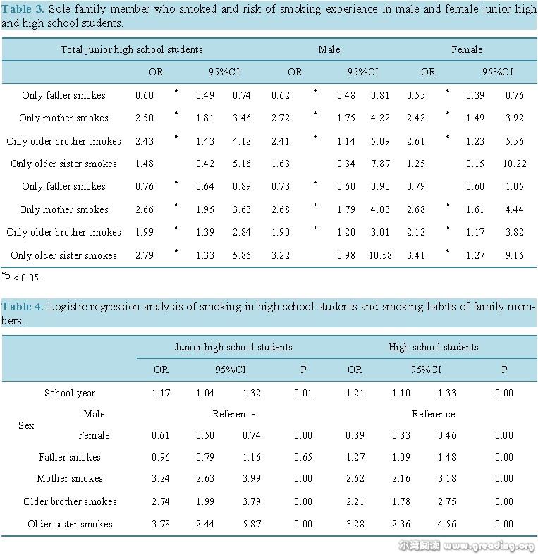 家庭吸烟习惯和吸烟人数,以及有否吸烟经验,都按初中生和高中生的范畴,分别展示在研究表格中,使研究群体的特征更为明显。研究还采用了Logistic回归分析,根据学年、性别和家庭吸烟习惯,对学生的吸烟经验进行分析。