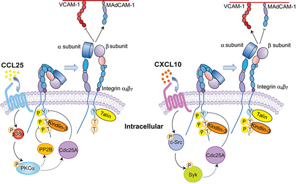 其中一类趋化因子会促进淋巴细胞与MAdCAM-1的黏附并抑制细胞与VCAM-1的黏附;另一类则具有完全相反的作用。其机制为这两类趋化因子分别通过激活不同的下游信号通路导致整合素β7亚基胞内区具有不同的磷酸化状态,从而引起整合素的两个重要胞内功能调节蛋白talin和kindlin-3与整合素α4β7的不同结合,并通过inside-out信号引起整合素α4β7的不同活化。