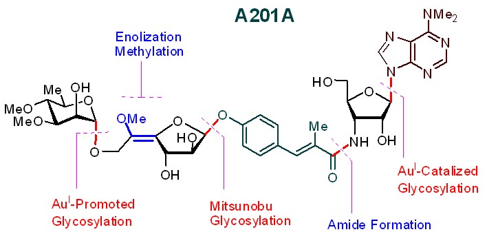 A201A是一个结构独特的核苷类抗生素,其中含环外烯醚的呋喃糖单元从未在其它天然产物中出现过。中国科学院上海有机化学研究所生命有机化学国家重点实验室俞飚课题组近期完成了A201A的首次全合成(J. Am. Chem. Soc. 2014, 136, 4157−4160)。