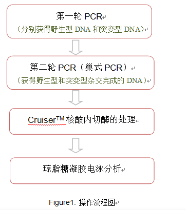 Genloci Cruiser突变检测试剂盒是一款简便高效的基因突变和基因多态性检测试剂盒,该试剂盒的核心成分是Cruiser酶,它是一种具有天然强活性的核酸内切酶,与CelⅠ同源。该酶能够高效特异地识别异源双链DNA的突变位点,并从突变位点的3’-端高效地切割异源双链DNA。Genloci Cruiser突变检测试剂盒广泛应用于精确检测人、哺乳动物、细菌、真菌、病毒以及植物基因的突变,也可用于基因的多态分析。