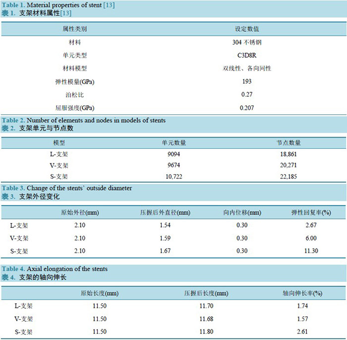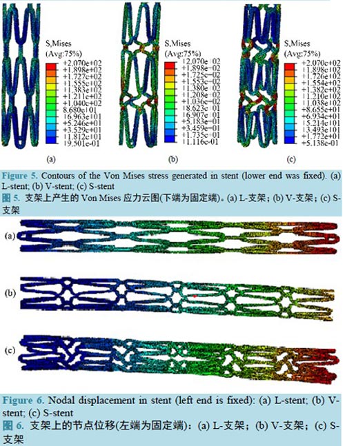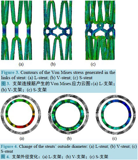 经过分析,研究人员得出结论:在相同的压握条件下,3种支架的应力分布比较均匀,分布在连接筋部位的应力较小;L-支架的弹性回复率最小,相比于另外两种支架其压握效果最好;V-支架发生轴向伸长的程度最小,使得支架压握于运输支架的球囊上时与球囊发生相对位移的几率小,同时较短的支架更有利于在血管中的运输,有利于临床手术的进行。