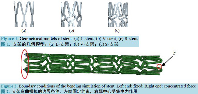 研究人员利用Pro/E三维软件构建了三种不同链接筋的支架模型,根据支架连接筋的结构分别称为L-支架、V-支架和S-支架(如图)。同时,他们对这三种支架的压握性能进行有限元数值模拟研究,应用ABAQUS软件模拟3种不同链接筋支架的压握和弯曲过程,并进一步分析3种支架的压握性能和柔顺性。