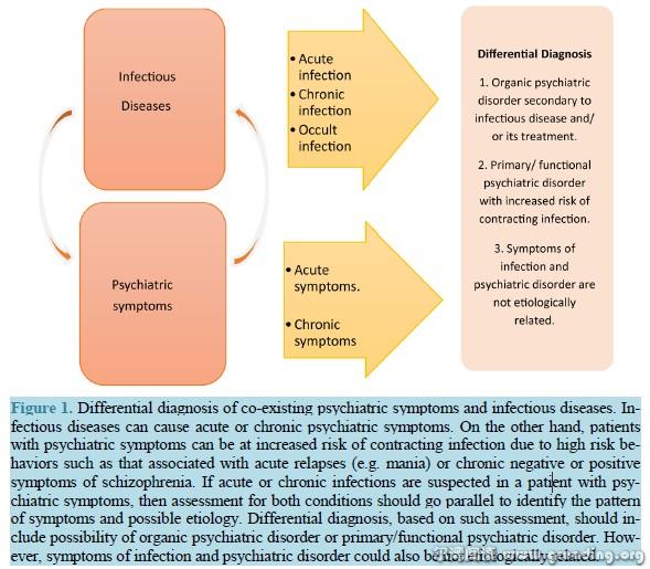 作者讨论了这些关系可能的联系,检查和鉴别诊断精神病和传染病的共存症状如下图1所示: