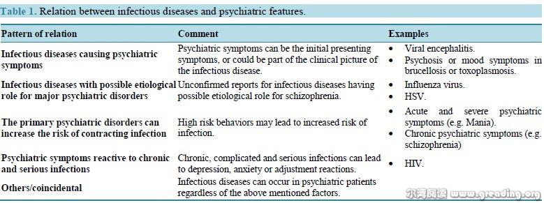 近日,阿联酋艾尔是医院(Al Ain Hospital)行为科学协会精神卫生服务组Amir Mufaddel等人在科研出版社英文期刊《Open Journal of Psychiatry》(精神病学期刊)2014年7月刊上发表文章,概括了传染病和精神病之间的关系特征,见下表1。