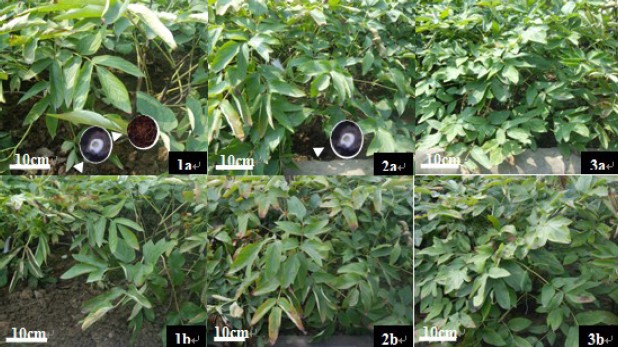 图1.不同组牡丹的生长状态:a组表示取样前的植物状态,b组表示取样后的植物状态,1表示伤口用创可贴处理组,2表示伤口不用创可贴处理组,3表示正常生长组。