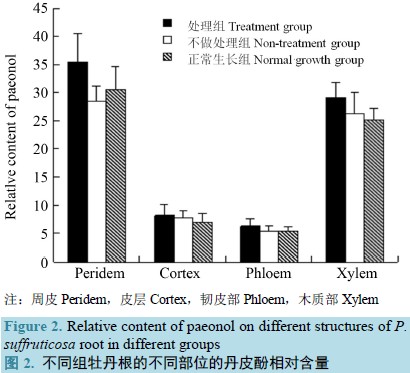 本实验中植物创可贴所使用的稻草、花椒等具有杀菌驱虫等作用,烧制成灰后,不仅能够为植物提供无机营养成分供创伤植物正常生长、提高种子活力,而且能显著提高根中丹皮酚含量(P<0.01)。植物根部受创易受到病菌侵染而造成根部腐烂、吸收功能减弱、地上部分由于养分供应不足而逐渐死亡,以根部入药的牡丹为对象研究植物活体取样方法,具有很好的代表性与一定的难度系数,更是在节约植物资源的前提下满足了后续实验对实验材料所需。