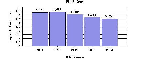 开放杂志先锋PLoS one尽管影响因子最近三年持续下跌,但是该杂志的论文投稿数量有增无减,是开放期刊中的希望灯塔。